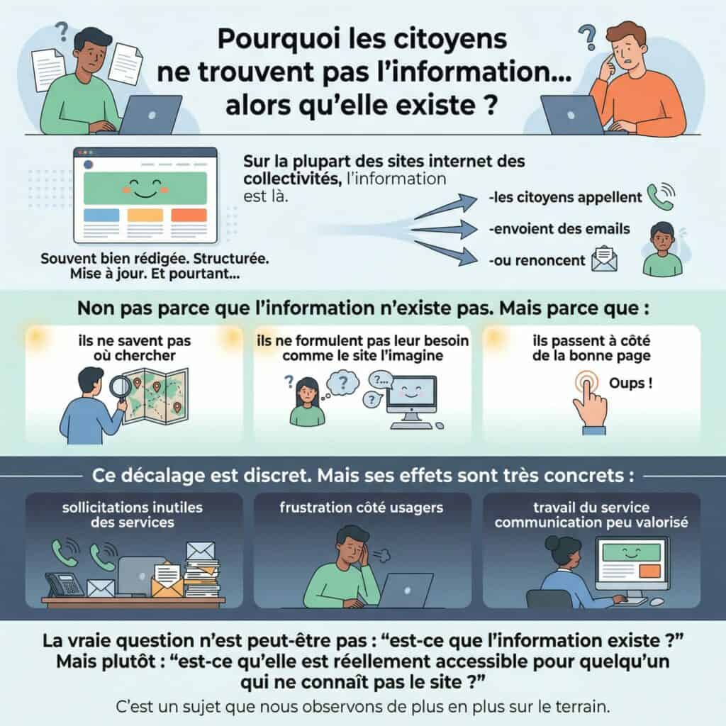 Parce que l’information est souvent organisée selon la logique interne des services, alors que les citoyens recherchent des réponses concrètes à leurs besoins quotidiens.